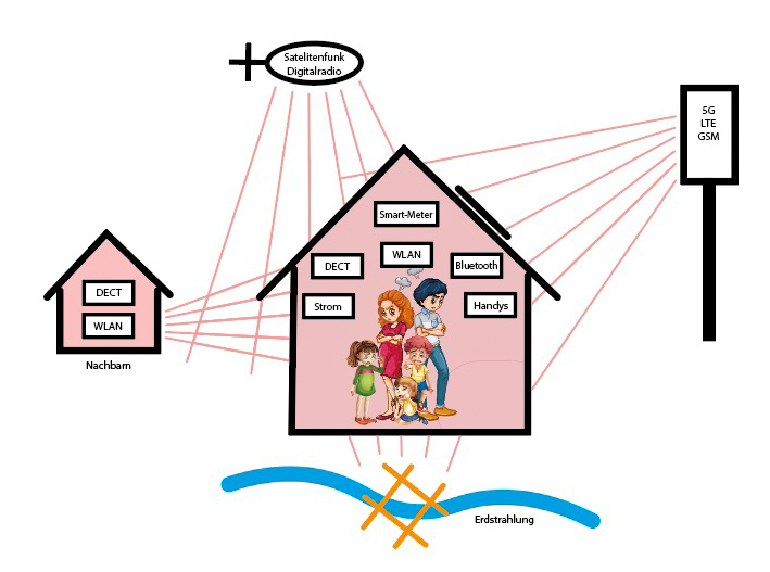 Equalizzazione di tutti i trasmettitori radio che ci circondano (WLAN, telefono cordless DECT, LTE, 5G, radio mobile GSM, baby monitor, contatori intelligenti, radio satellitare, radar, ecc.)